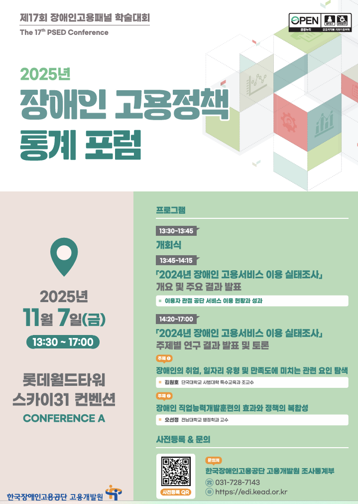 - 대 회 명: 제17회 장애인고용패널 학술대회「장애인 고용정책 통계 포럼」