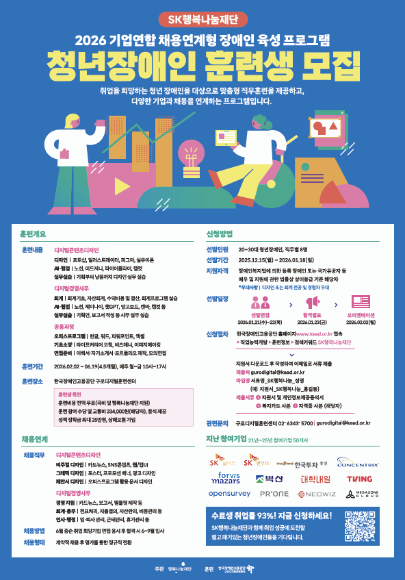 구로디지털훈련센터는 SK그룹의 사회공헌 전문 재단인 SK행복나눔재단과 협력하여 장애인 인재육성 및 채용연계형 훈련을 진행하고 있습니다. 디자인, 사무 직무로 취업을 희망하는 청년 장애인을 대상으로 맞춤형 직무훈련을 제공하고, 다양한 기업과 채용을 연계하는 프로그램이니 많은 참여 바랍니다.
