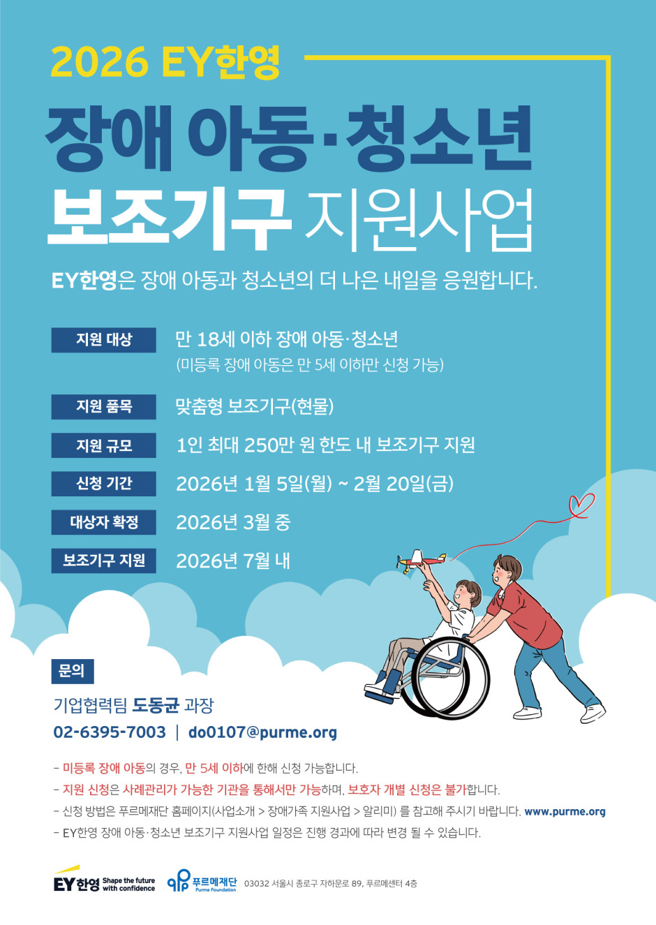 [푸르메재단] 2026 EY한영 장애아동‧청소년 보조기구 지원사업 신청 안내 페이지 정보 작성자 최고관리자 댓글 0건 조회: 21회 작성일 26.01.12 신청/접수 기간: 신청/접수 가능지역: 목록 답변 자료출처 URL https://purme.org/board/distribution/8099 7회 연결 본문 **신청을 희망하시는 분은 장애와가족플랫폼 사회적협동조합 전화 0505-055-6789 연락 바랍니다. 출처: 푸르메재단 https://purme.org/ 이전글 [우양재단] 2026년 우양재단 마루ㆍ나래ㆍ다솜 신규 장학생 모집 (~1/26) 26.01.12 목록 다음글 [복지뱅크] 보건복지부 시각장애인음악재활센터지원(실로암시각장애인복지관) 26.01.09