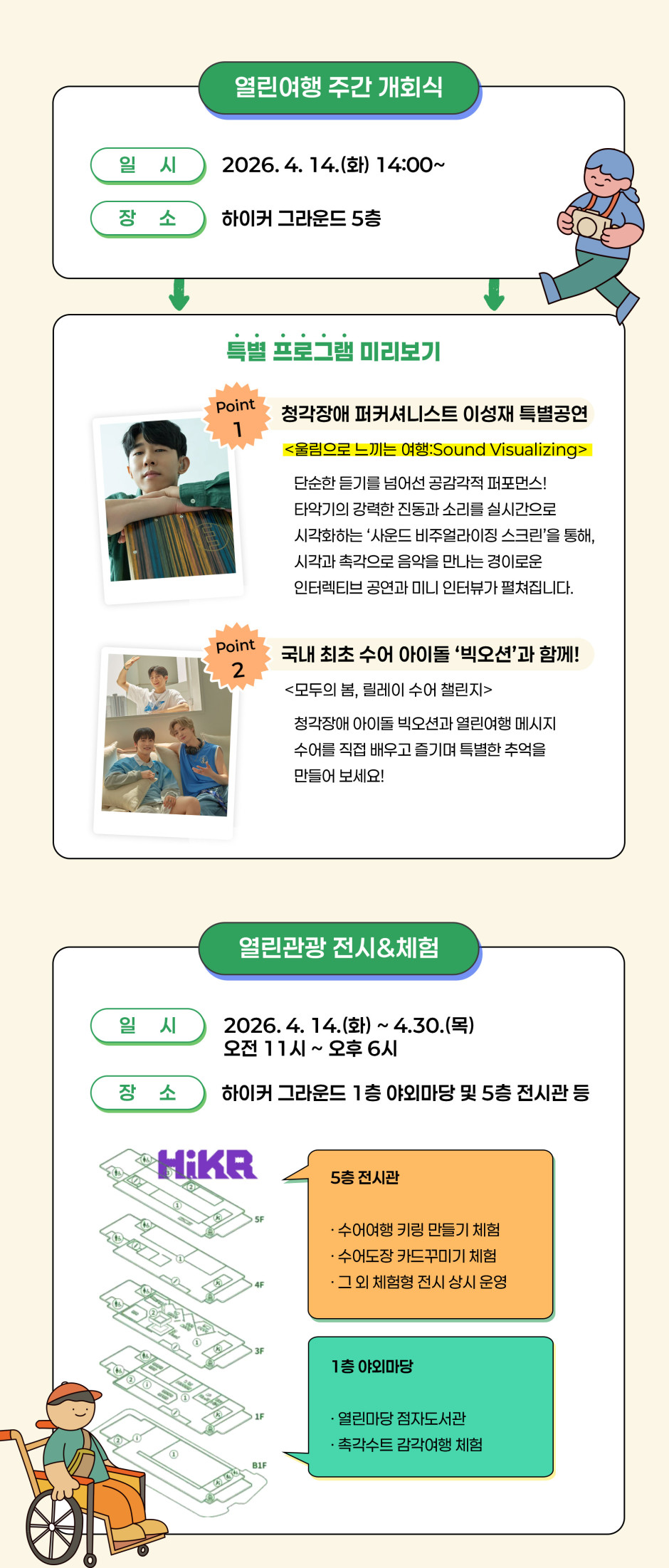 [열린관광 모두의 여행] 모두의 봄 열린여행 페이지 정보 작성자 최고관리자 댓글 0건 조회: 41회 작성일 26.04.13 신청/접수 기간: 신청/접수 가능지역: 목록 답변 자료출처 URL https://access.visitkorea.or.kr/main/accessWeek.do 12회 연결 본문 출처: 열린관광 모두의 여행 https://access.visitkorea.or.kr/main/main.do 이전글 [고양시장애인종합복지관] 제4회 'gallery 비상' 전국장애인미술공모전 접수 안내 26.04.14 목록 다음글 [한국장애인재단] 장애인식개선강사 민간자격시험 접수 26.04.10