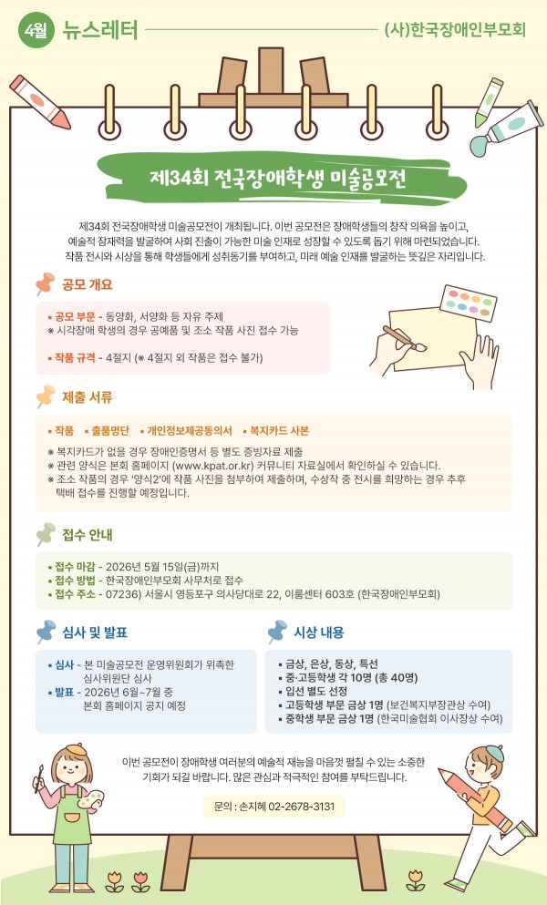 [한국장애인부모회] 제34회 전국장애학생 미술공모전 페이지 정보 작성자 최고관리자 댓글 0건 조회: 36회 작성일 26.04.15 신청/접수 기간: 신청/접수 가능지역: 목록 답변 자료출처 URL https://www.kpat.or.kr/bbs/board.php?bo_table=0801&wr_id=861 12회 연결 본문 출처: 한국장애인부모회 https://www.kpat.or.kr/ 이전글 [삼성소리샘복지관] 2026 소리샘돌봄캠프 참여자 모집(4/13~4/30) 26.04.15 목록 다음글 [고양시장애인종합복지관] 제4회 'gallery 비상' 전국장애인미술공모전 접수 안내 26.04.14