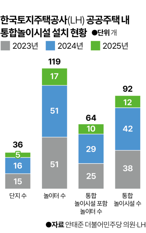 사진 아래: 최근 3년간 지어진 LH 공공주택 내 통합놀이시설 설치 현황. 그래픽=박종범 기자