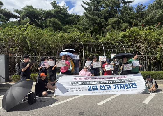 장애인차별금지추진연대(이하 장추련)는 18일 서울고등법원 앞에서 ‘선거관리위원회, 발달장애인 투표보조 지원거부 차별구제청구소송 2심 선고 기자회견’을 개최했다.