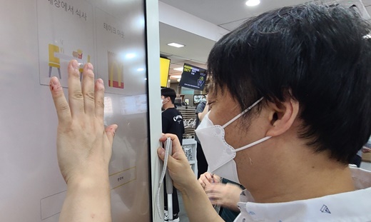 2022년 7월 11일 오전 11시 30분경, 서울 중구 한 패스트푸드점에서 열린 시각장애인권리보장연대의 ‘내돈내산 권리찾기 캠페인’ 모습. 한 시각장애인이 키오스크를 클릭해 주문하려했지만 실패하고 있다.ⓒ에이블뉴스DB