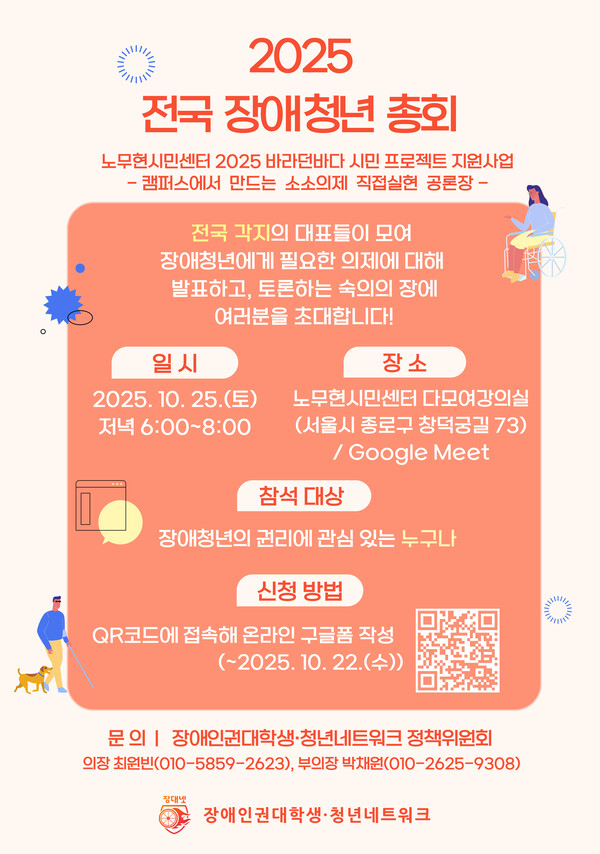 행사는 온·오프라인 병행 방식으로 진행되며, 현장 참여가 어려운 참가자는 Google Meet을 통해 온라인으로 참여할 수 있다. 장애청년의 권리와 정책에 관심 있는 누구나 참여 가능하며, 온라인 신청은 10월 22일까지 QR코드를 통해 진행된다.