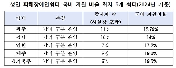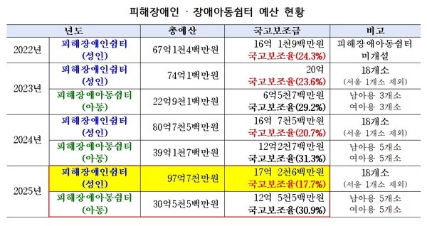 올해에는 총예산 97억7000만 원 중 국비가 17억2600만 원으로, 보조율 17.7%를 기록했다. 사업 규모가 커졌음에도 국비 비율이 낮아지면서, 인건비와 운영비 부담이 지방정부에 전가되는 구조가 고착되고 있다. 피해장애인쉼터는 입소자는 늘고 국비 지원은 줄어드는 ‘역행 구조’에 놓여 있는 것이다.