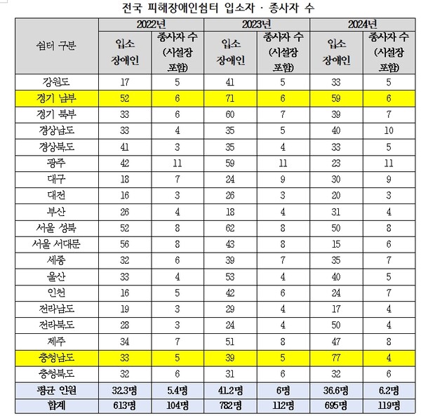 종사자 인력 부족 문제는 경기 남부와 충남 지역이 가장 심각했다. 경기 남부 쉼터의 입소 장애인은 2022년 52명, 2023년 71명, 2024년 59명으로 매년 60명 안팎에 달했으나, 직원 수는 3년 내내 6명으로 동일해 매년 직원 1명이 평균 10명의 피해장애인을 담당했다.