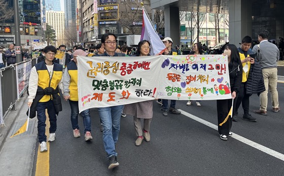 권리중심 중증장애인 맞춤형 공공일자리를 통해 일하고 있는 장애인 노동자와 활동가들이 지속가능한 권리중심공공일자리와 노동자의 근무환경 개선을 촉구하며 행진했다. ⓒ전국권리중심중증장애인맞춤형공공일자리협회