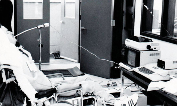 사진2 1981년 사지가 마비된 닐 스퀘어가 오래된 타자기를 개조해 만든 장치 ‘sip-and-puff(마시고 내쉬기)’를 사용하고 있다. 닐 스퀘어 소사이어티 제공