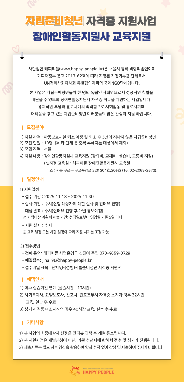 [해피피플] 자립준비청년 자격증 지원사업 - 장애인활동자원사 교육지원-