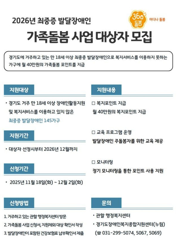 지원 대상은 경기도에서 거주하는 복지관, 직업재활서비스 등 복지서비스 미이용으로 돌봄사각지대에 놓인 만 18세 이상 발달장애인이다. 선정 시 월 40만원 가족돌봄포인트를 1년간 지원하고 지속적인 모니터링으로 복지서비스와 대상자를 연계하는 서비스를 제공한다.