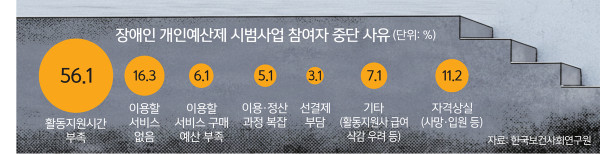 시범사업 참여 중단 사유가 확인된 98명 중에서도 절반이 넘는 55명(56.1%)이 ‘활동 지원 시간이 부족하다’고 응답했다. 이어 ‘이용할 서비스 없음’ 16.3%, ‘이용 서비스 구매 예산 부족’ 6.1%, ‘이용 과정 복잡’ 5.1% 등의 순이었다. 활동지원 서비스 시간이 절실한 장애인에게는 개인 예산제를 이용하는 데 장벽이 존재한다는 분석이다.