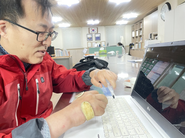 ▲홍서씨는 척수사이 네이버 카페에 자신의 경험을 글로 남기고 있다.보조기구를 이용해 글을 쓰는 모습 ⓒ 박홍서