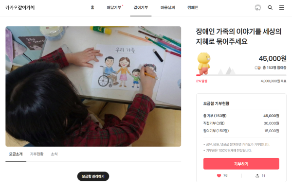 장애인 가족의 천만가지 이야기를 기대하며, <카카오같이가치> 모금함에 많은 참여를 바란다.